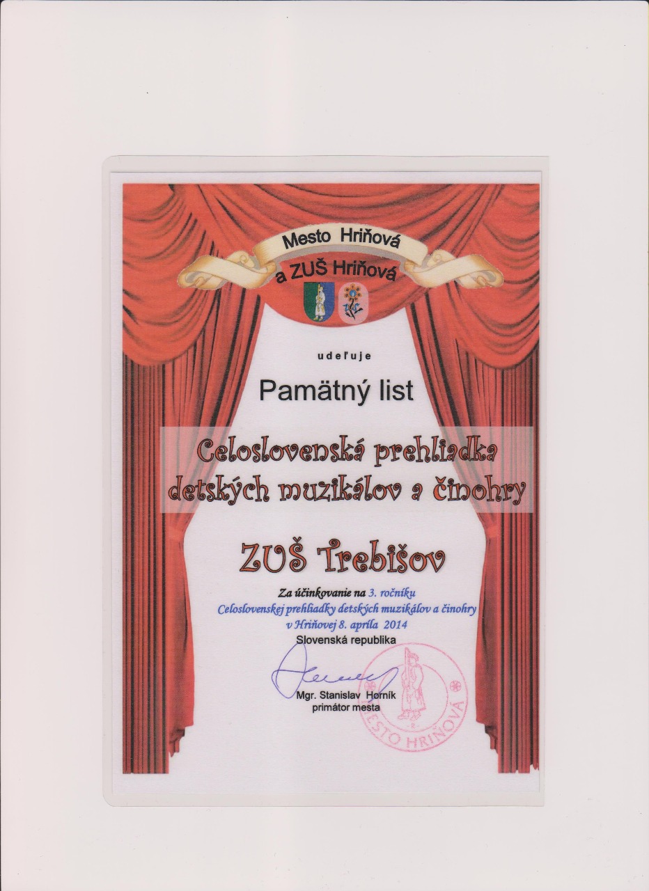 8. apríla 2014 sa žiaci ZUŠ Trebišov zúčastnili Celoslovenského festivalu muzikálov v Hriňovej s veľkým úspechom. Porota zložená z odborníkov z Akadémie umení v Banskej Bystrici , nami predvedený muzikál ,,Nebuď labuť " , ocenili pamätným listom. Poďakovanie patrí všetkým, ktorí vynaložili nemalé úsilie pri nácvikoch, ako aj zvládli podať kvalitný výkon v podmienkach, ktoré pre nás pripravili ZUŠ Hriňová, Mestské kultúrne stredisko Hriňová a Mesto Hriňová.